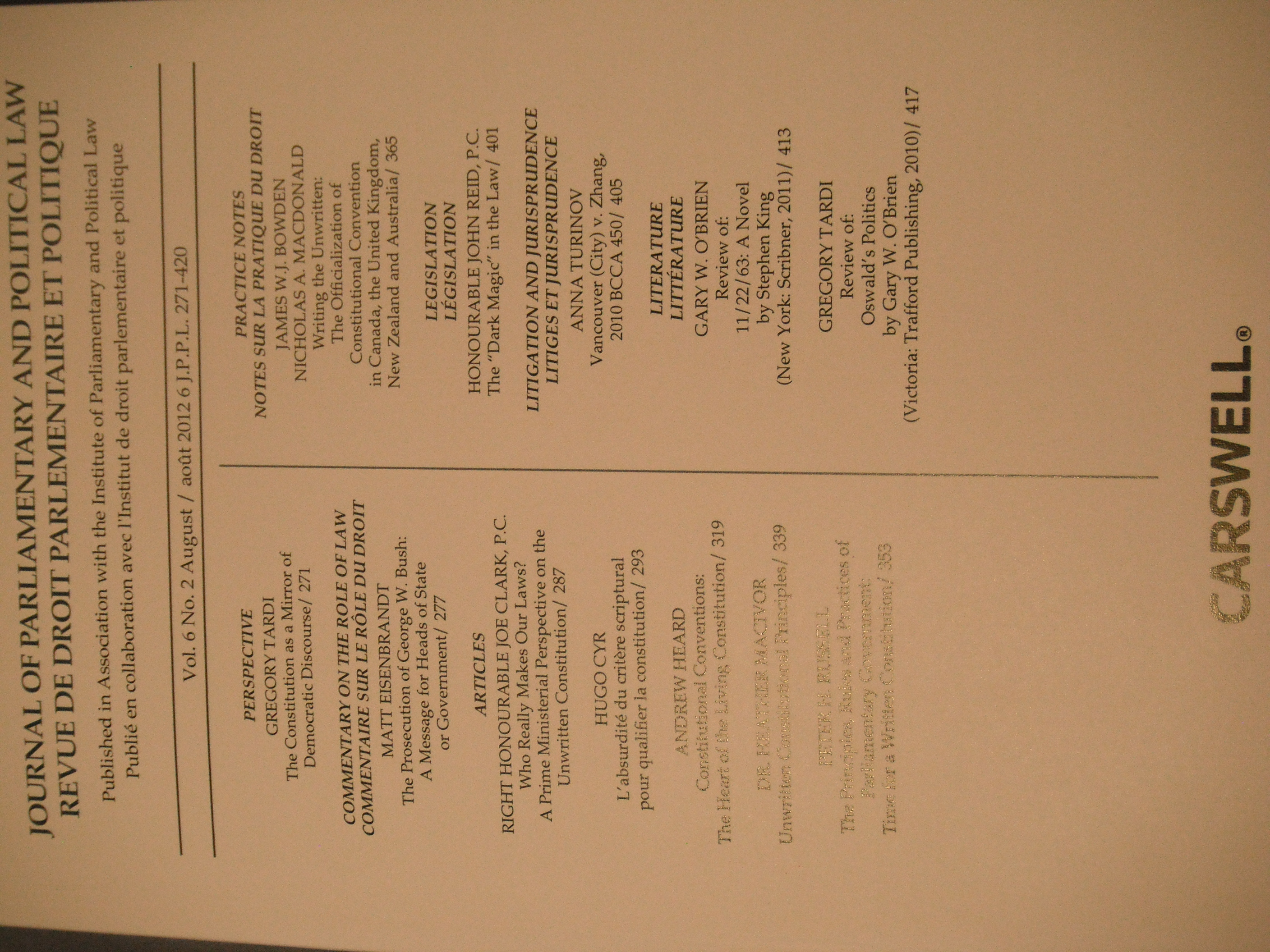 The Journal of Parliamentary and Political Law has released volume 6, issue 2 of August 2012, which contains six articles on constitutional conventions by the Rt. Hon. Joe Clark, Hugo Cyr, Andrew Heard, Heather MacIvor, Peter Russell.