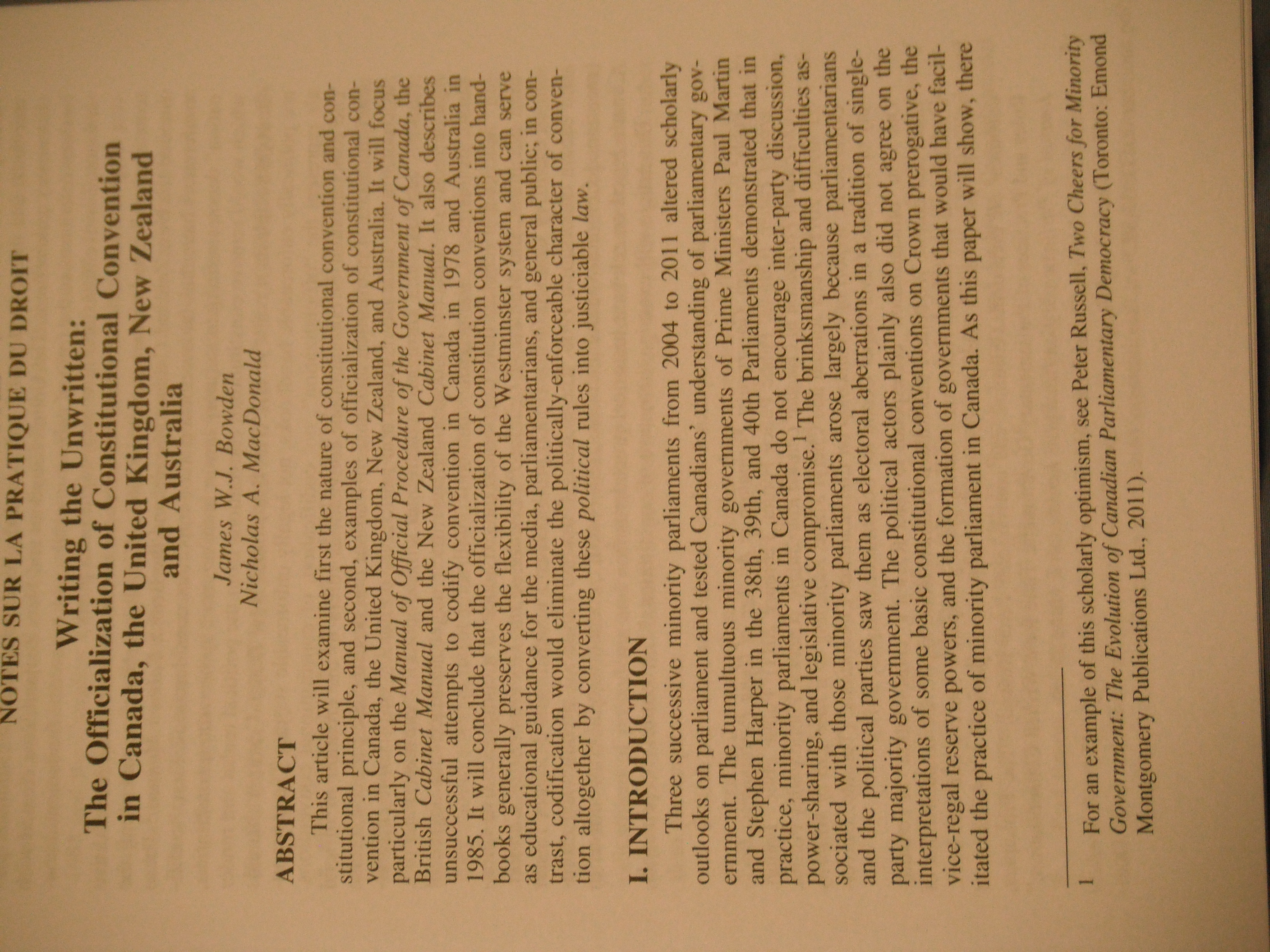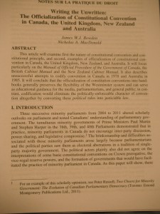 My friend Nick MacDonald and I wrote the last in the series, called “Writing the Unwritten: The Officialization of Constitutional Convention in Canada, the United Kingdom, New Zealand, and Australia.” It describes the following: