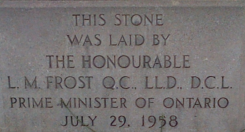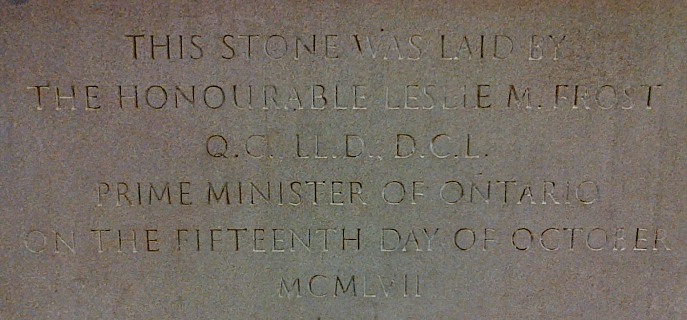 Ironically, however, the use of “Prime Minister of Ontario” in English does propagate a political statement and seeks to elevate Ontario to the level of Canada. Leslie Frost served as the 16th Premier of Ontario from 4 May 1949 to 8 November 1961 – but he referred to himself as “Prime Minister of Ontario” rather than as “Premier of Ontario.” As the two photos in this blog entry show, several plaques on buildings that he commemorated have etched this title in stone. I found the first in downtown Toronto, and the other comes from the Tory Building at Carleton University. Frost’s moniker built on another precedent of self-aggrandizement: Ontario also dubbed its provincial legislature the “Provincial Parliament” and “Members of Provincial Parliament” in 1938. [4]