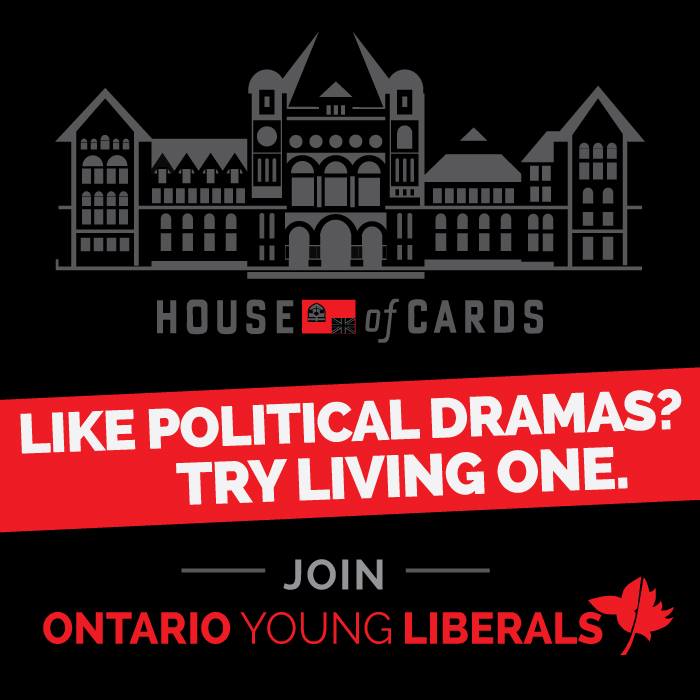 The Ontario Young Liberals seem oblivious to irony and satire, because this promotional poster in fact reflects poorly on the Liberal Party of Ontario and on the McGuinty and Wynne Governments. An astute politico who has watched House of Cards might very well think – though I couldn’t possibly comment – that the Young Liberals are suggesting that Kathleen Wynne represents Frank Underwood, and that she orchestrated the Gas Plant Scandal as a pretext for McGuinty’s resignation in 2013 so that she could become leader of the Liberal Party and Premier of Ontario.