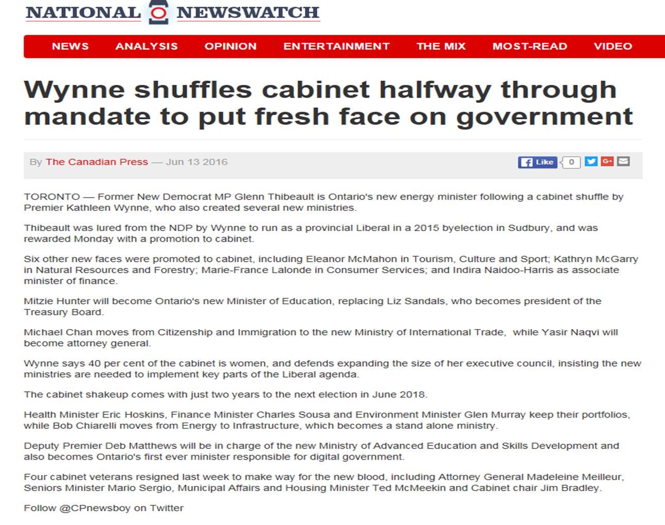 On 13 June 2016, the Canadian Press reported  on Premier Wynne’s  mid-parliament cabinet shuffle, which will take her government into the next provincial election. According to the Canadian Press, the next provincial general election is scheduled for June 2018 — but in fact, it is scheduled for October 2018. (I’ve posted these screenshots in case that the Canadian Press updates its article accordingly!)