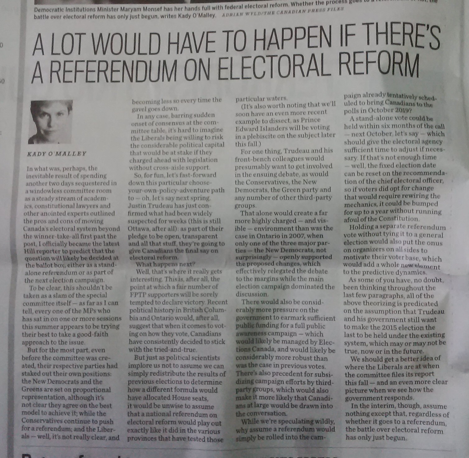 Kady O’Malley’s column in the Ottawa Citizen of 27 August 2016, “A Lot Would Have to Happen If There’s A Referendum on Electoral Reform,” contained some bizarre, false premises on the nature of electoral law, from the electoral system itself, to holding a referendum on altering it, to the fixed-date elections law.