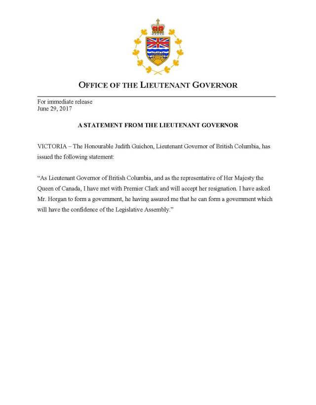 “As the Lieutenant Governor of British Columbia, and as the representative of Her Majesty the Queen of Canada, I have met with Premier Clark and will accept her resignation. I have asked Mr. Horgan to form a government, he having assured me that he can form a government which will have the confidence of the Legislative Assembly.”[3]