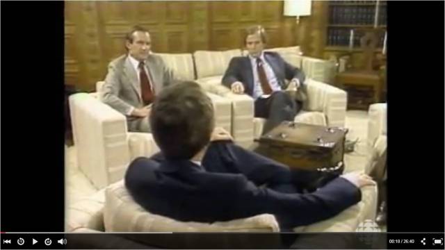 Clark’s hypocrisy and mendacious omission of relevant historical facts becomes all the more glaring in light of another interview between Prime Minister Clark and Peter Mansbridge, which took place on 8 October 1979.[24] Knowlton Nash started off the line of questioning at 11:46 into the interview, and Peter Mansbridge finished it:
