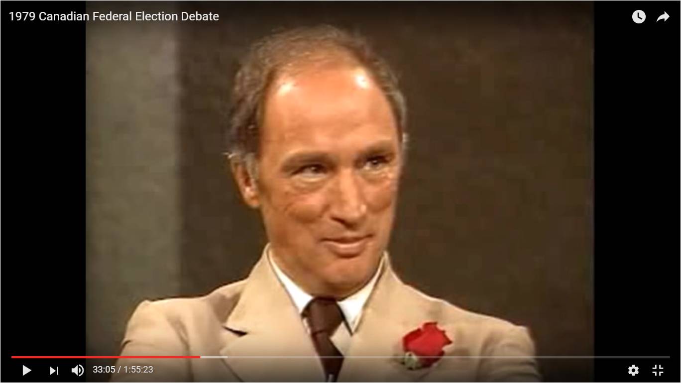 The election campaign of 1979 foreshadowed Clark’s downfall: his refusal to work constructively with the opposition parties. In the televised leaders’ debate for the 1979 election, moderated by current Governor General David Johnston, Clark actually boasted that if the Progressive Conservatives won a plurality, he would still govern as prime minister as if they had won a majority.[11] This statement starts at 32 minutes, 44 seconds into the video: