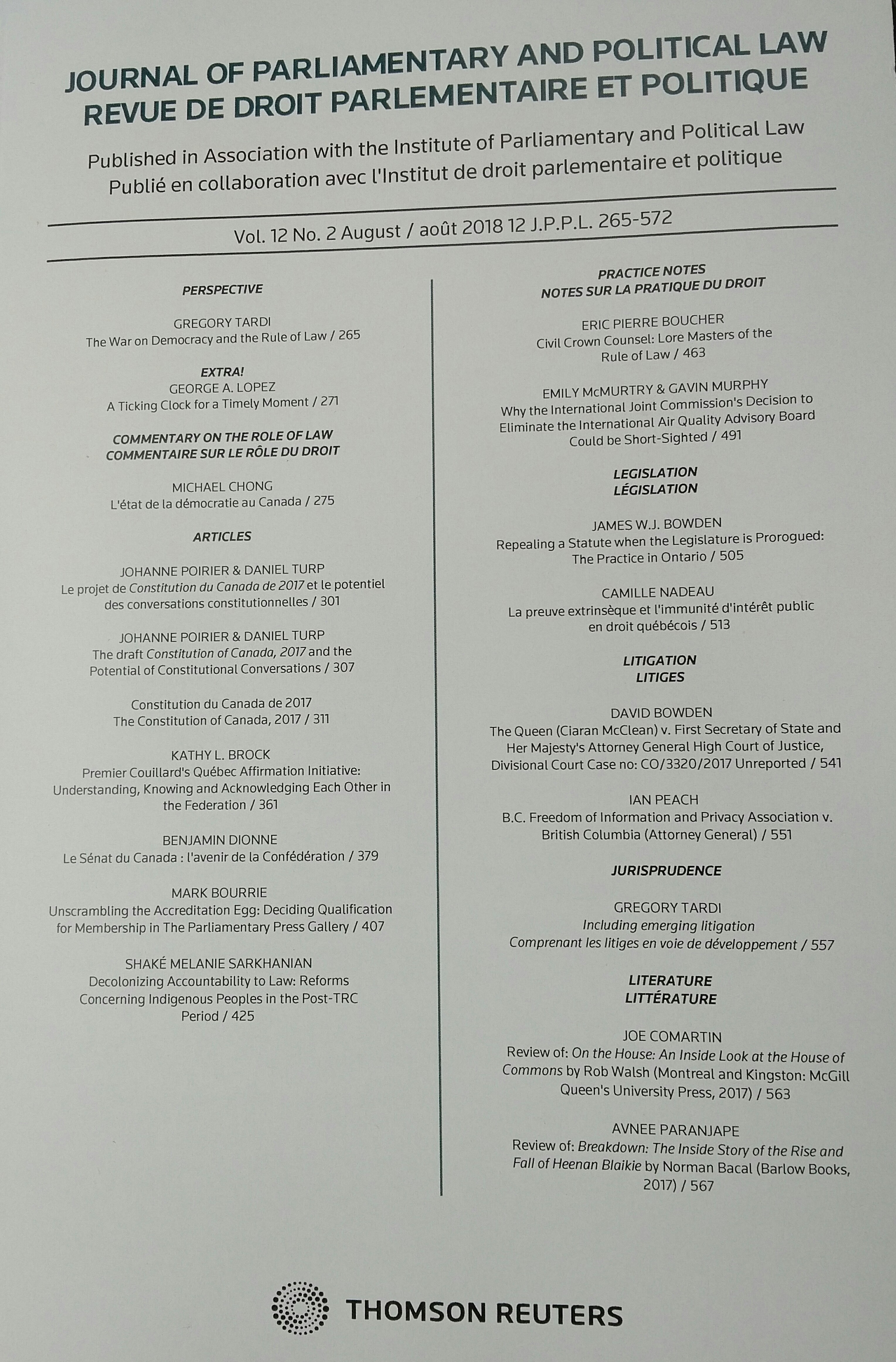 The Journal of Parliamentary and Political Law has just come out with its latest issue in which a short article of mine appears.