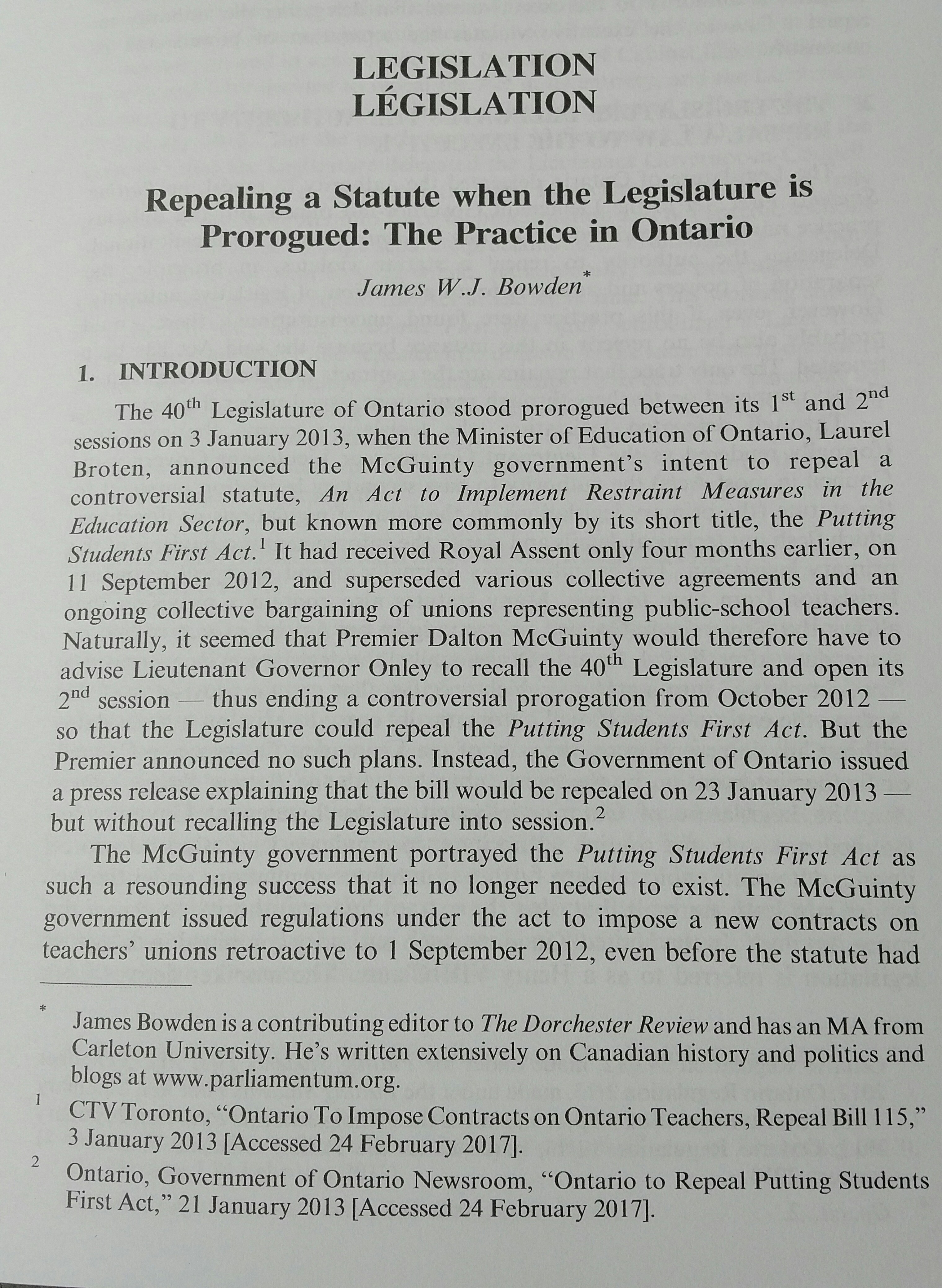 - A Law Can Be Repealed When the Legislature Is Prorogued? The Separation of Powers and the Limits of Delegated Legislation in Ontario
