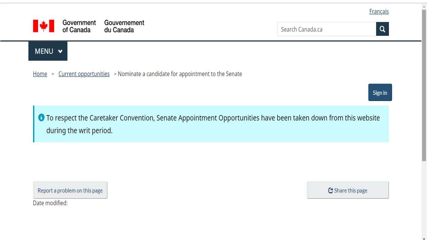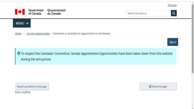 For instance, the Independent Advisory Board for Senate Appointments has temporarily removed the portion from its website that presumptuously allowed applicants to submit their names for consideration: “To respect the Caretaker Convention, Senate Appointment Opportunities have been taken down from this website during the writ period.” Applying to become a Senator does not require any immediate action on the part of the Government of Canada but instead relies on the initiative of the individuals who put their names forward. This process does not touch upon the Caretaker Convention at all.