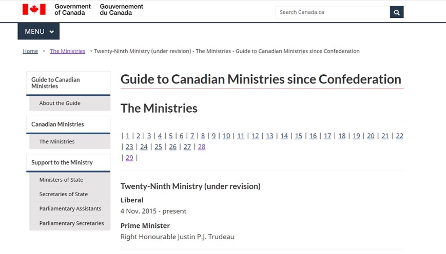 [10] Canada, Privy Council Office, “Twenty-Eighth Ministry” in Guide to Ministries Since Confederation, 9 January 2018.