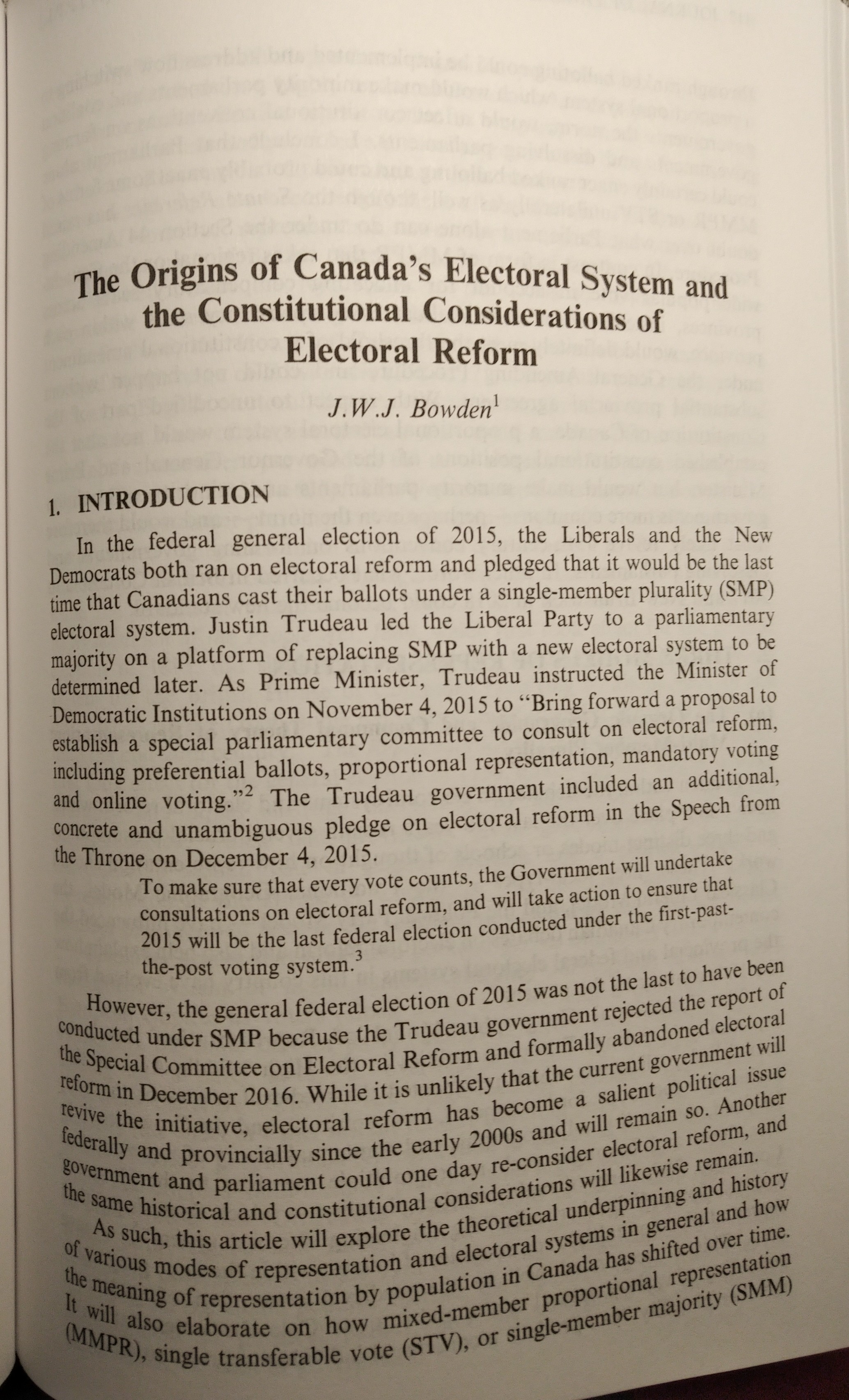 This larger manuscript (as it existed in November 2016) was originally going to appear in the Canadian Parliamentary Review. But a few days after I fact-checked Elizabeth May and other pro-proportional representation advocates in an entertaining manner on Twitter in real time at a conference at the University of Ottawa on 3 November 2016, the Canadian Parliamentary Review coincidentally, and definitely not causally, reversed its decision and refused to publish my article. But this blessing in disguise gave me more time to respond to Pilon’s counter-arguments to my earlier work, explore all the constitutional requirements for each type of electoral reform, and fully flesh out the constitutional history of electoral reform in Canada for the Journal of Parliamentary and Political Law instead.