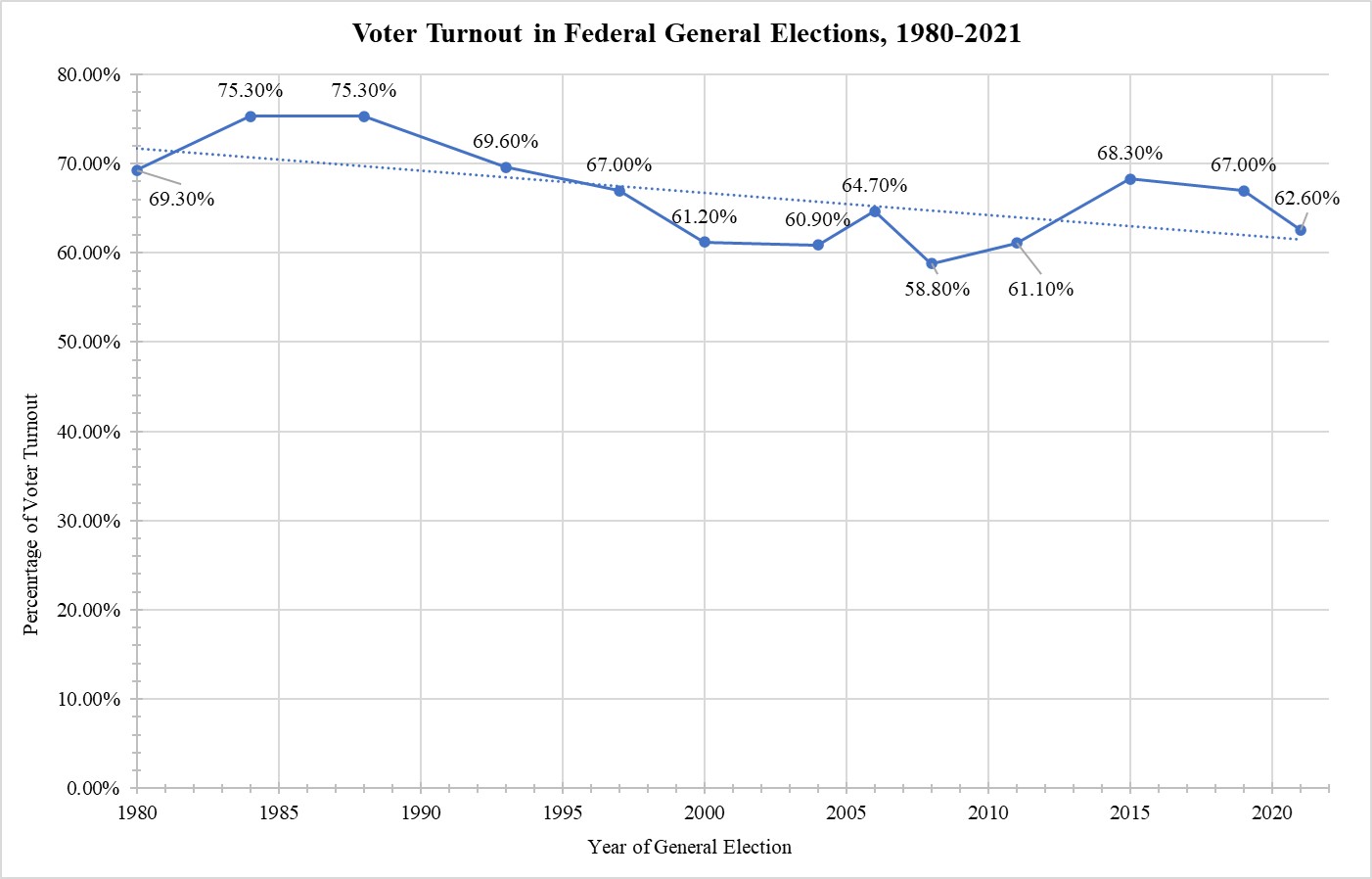 [3] Elections Canada, “Voter Turnout at Federal Elections and Referendums,” 10 October 2023 [accessed 10 November 2023].