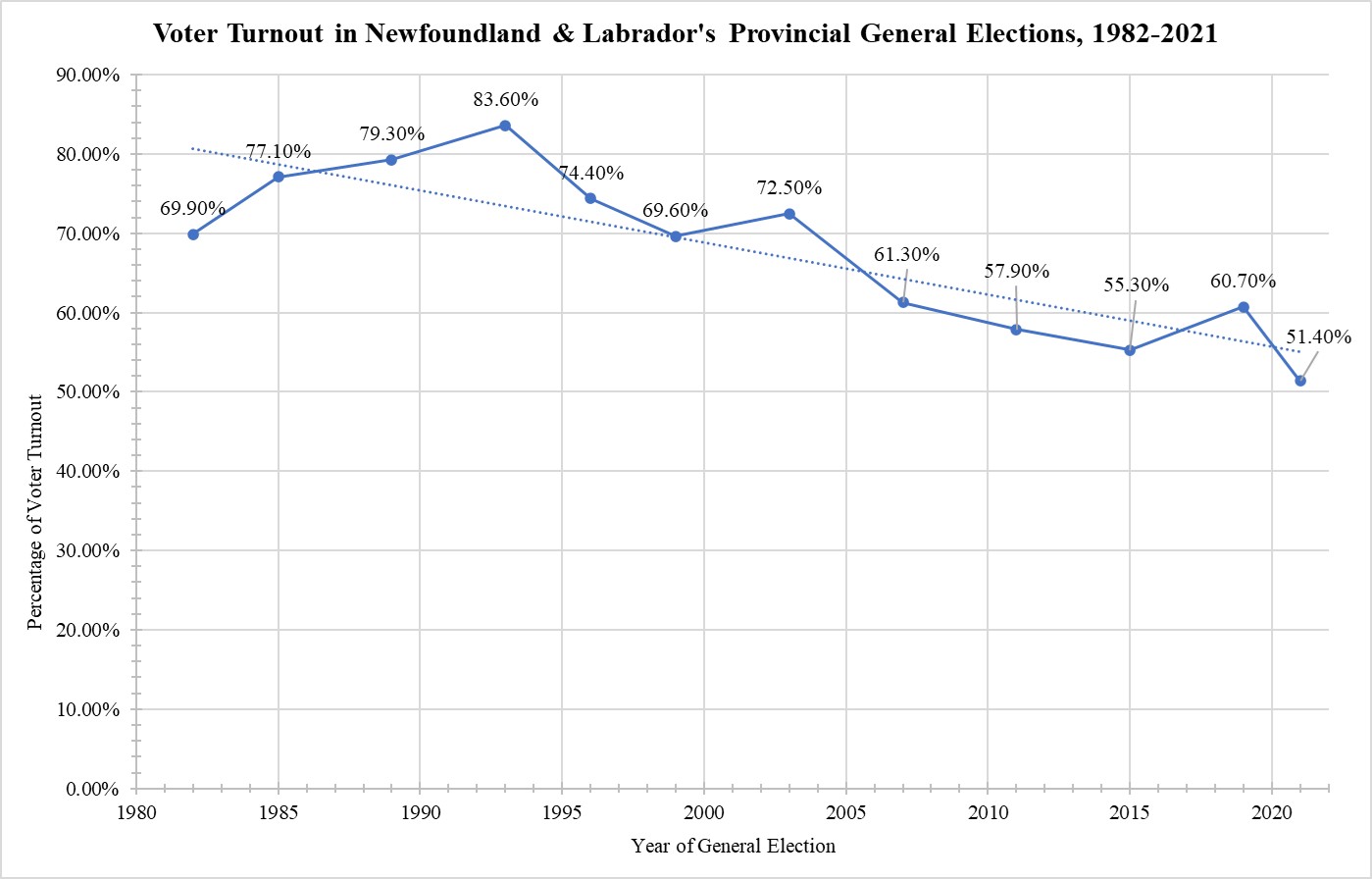 [4] Elections Newfoundland & Labrador, “Historical General Election Statistics (1949-2019)” in 2021 Provincial General Election Report (St. John’s: Chief Electoral Officer, 10 November 2021), at page 352.