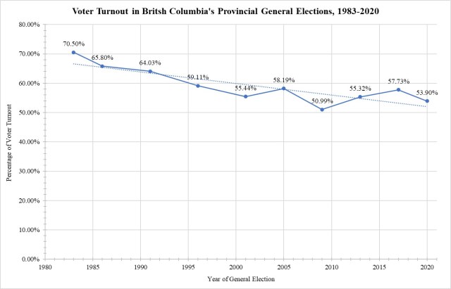[13] Elections British Columbia, “Figure 14: Voter Participation in Provincial General Elections, 2001-2020,” in Report of the Chief Electoral Officer: Provincial General Election, October 24, 2020 (Victoria: Chief Electoral Officer, 27 July 2021), at page 54; Elections British Columbia, “Figure 7: Voter Participation, 1983-2017,” in Report of the Chief Electoral Officer: Provincial General Election, May 9, 2017 (Victoria: Chief Electoral Officer, 12 March 2018), at page 56. In this particular report, Elections British Columbia distinguishes between two metrics: “turnout as a percentage of registered voters” (which is invariably higher) versus “turnout as a percentage of estimated eligible voters).” The other provincial elections agencies do not distinguish between the two, but their reports probably use the latter, lower metric. The report from 2021 cites only the percentage of estimated eligible voters, so I have used this metric throughout to preserve the consistency of British Columbia’s statistics.
