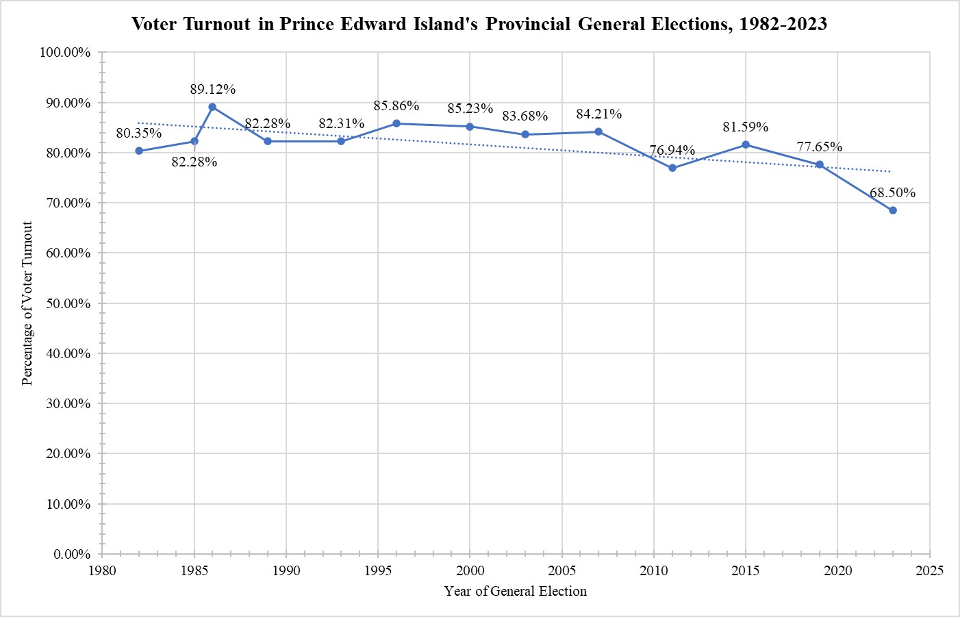 [5] Elections Prince Edward Island, “2023 Provincial General Election,” Press Release of 3 April 2023; Elections Prince Edward Island, “Historical Statistics on Provincial General Elections from 1966 to 2019,” in Report of the Chief Electoral Officer of PEI: 2019 Provincial General Election (Charlottetown: Chief Electoral Officer, 12 November 2019), at page 37. Prince Edward Island used dual-member districts from the general elections of 1893 to 1993, inclusive. The general election in 1996 was the first to feature single-member districts. From 1982 to 1993, I have opted for the voter turnout for assemblymen rather than for councillors.