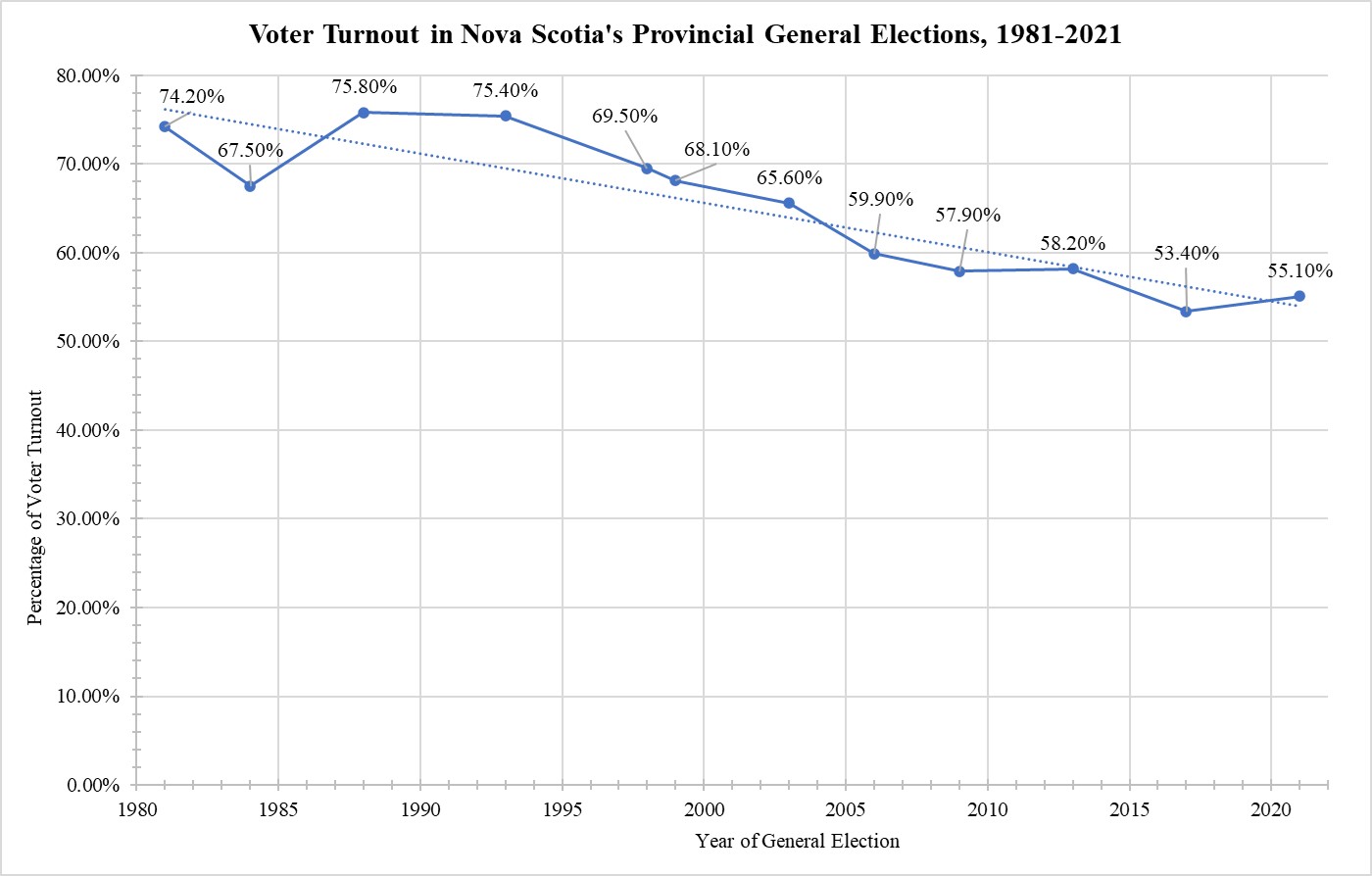 [6] Elections Nova Scotia, “Historical Voter Turnout,” in 40th Provincial General Election: Volume I – Statement of Votes & Statistics (Halifax: Chief Electoral Officer, September 2017), at page 1-39; Elections Nova Scotia, “Historical Voter Turnout,” in 41st Provincial General Election: Volume I – Statement of Votes & Statistics (Halifax: Chief Electoral Officer, 31 January 2022), at page 36.