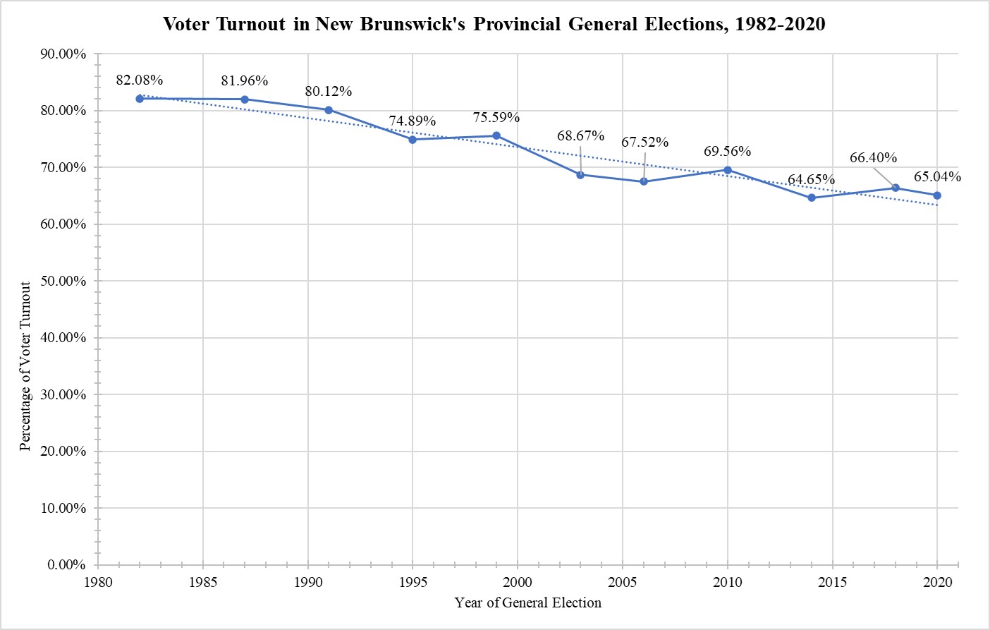 [7] Elections New Brunswick, “Comparative Statistics – General Elections, 1967 to 2020,” in Report of the Chief Electoral Officer: Fortieth General Provincial Election: September 14, 2020 (Fredericton: Chief Electoral Officer, 15 February 2021), at page 26.