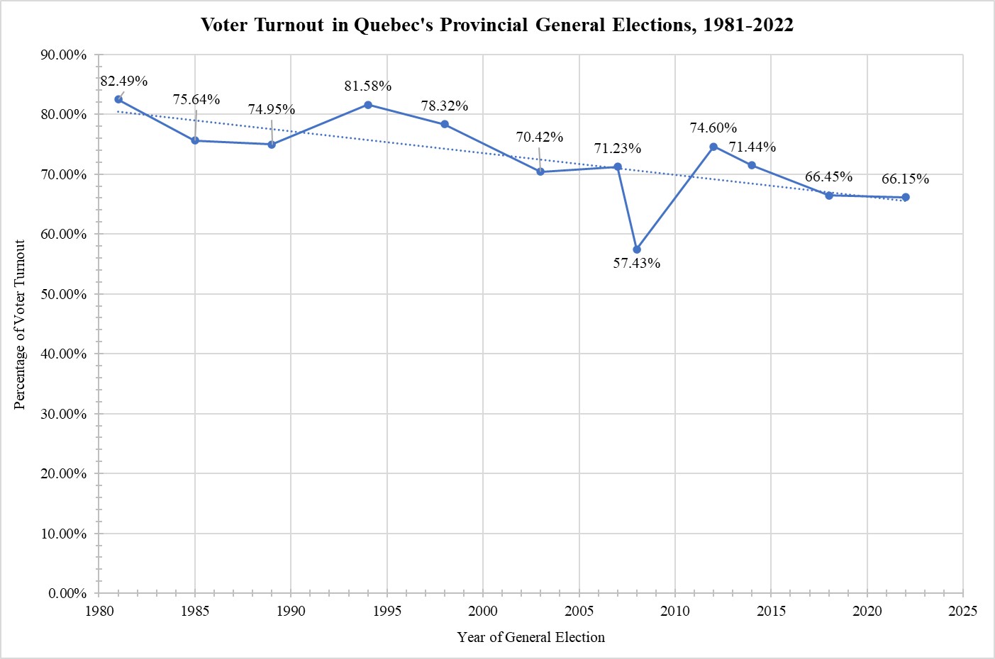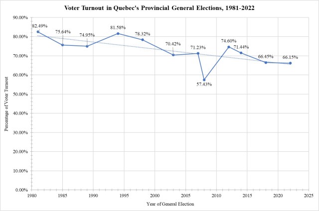 [8] Elections Quebec, “Statistics on General Elections Held Since 1867: Voter Turnout,” accessed 9 November 2023.