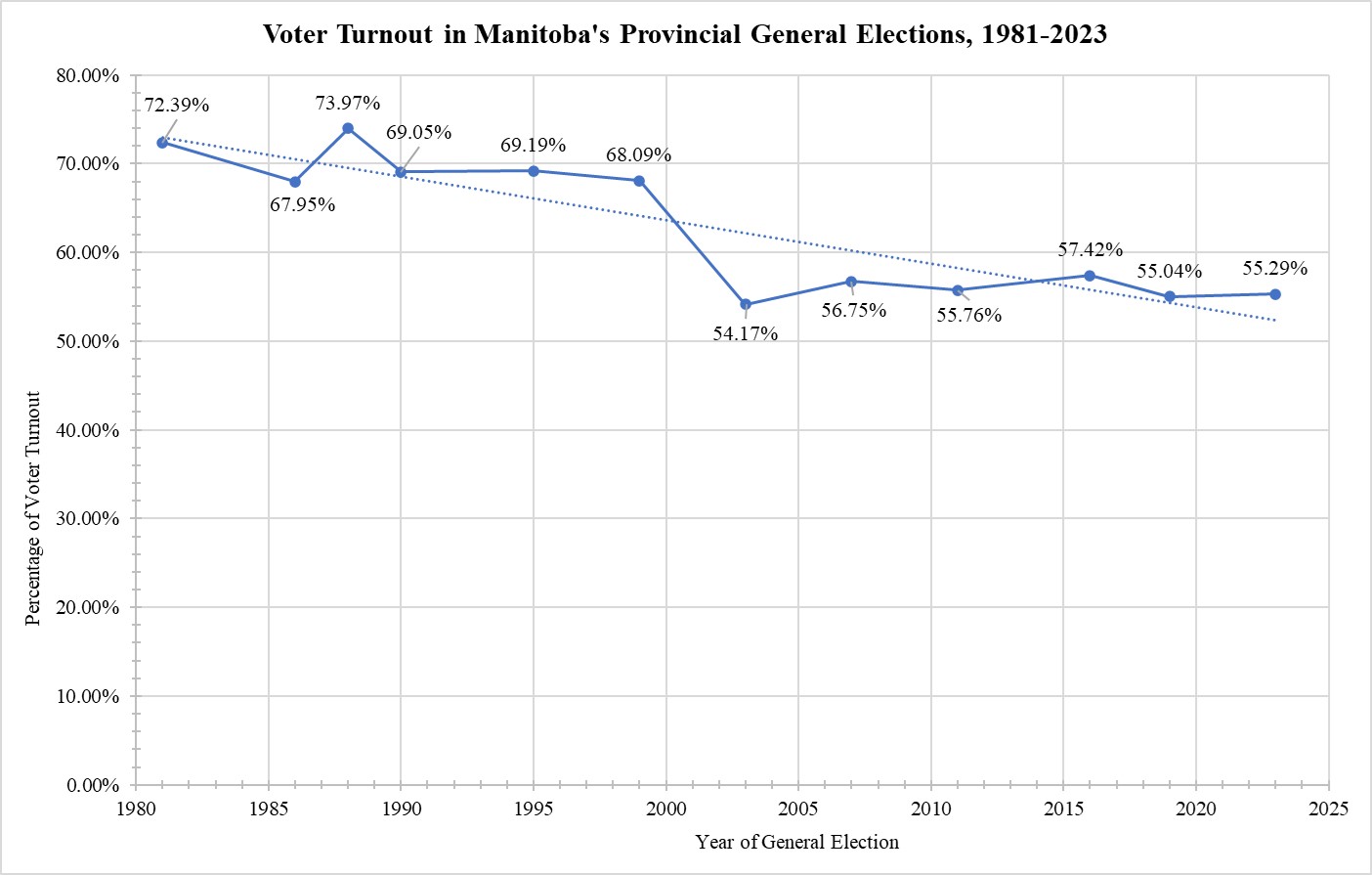 [10] Elections Manitoba, “Official Results: Manitoba’s 43rd General Election – October 3, 2023,” accessed 10 November 2023; Elections Manitoba, “Voter Turnout in Manitoba Provincial Elections: 1981 to 2019,” in Statement of Votes for the 42nd Provincial General Election: September 10, 2019 (Winnipeg: Chief Electoral Officer, 2019), at page 20.