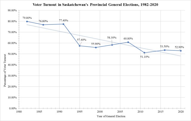 [11] Elections Saskatchewan, “Voter Turnout” in A Report on the Twenty-Ninth General Election: Volume I – Statement of Votes (Regina: Chief Electoral Officer, 30 June 2021), at page 17.