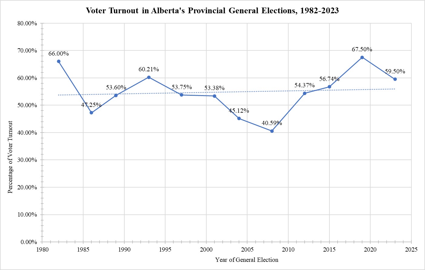 [12] Elections Alberta, “Election Results: Provincial General Election, May 29, 2023,” accessed 10 November 2023; Elections Alberta, “Comparative Statistics: Overall Summary of Ballots Cast and Percentage of Voter Turnout,” 2019 General Election: A Report of the Chief Electoral Officer, Volume Iv (Edmonton: Chief Electoral Officer, March 2020), at page 75.