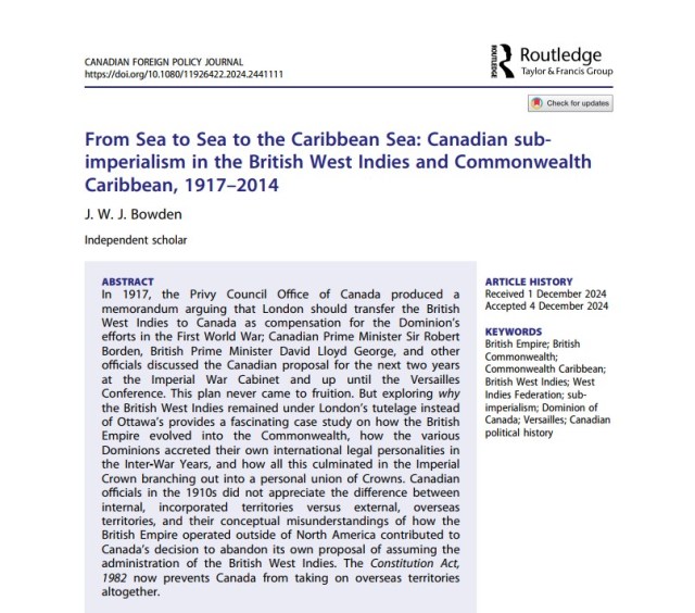 The Canadian Foreign Policy Journal pleasantly surprised me on 18 December by publishing the electronic version of my article “From Sea to Sea to the Caribbean Sea: Canadian Sub-Imperialism in the British West Indies and Commonwealth Caribbean, 1917-2014.” I had forgotten that Taylor and Francis’s journals tend to publish an article online separately before releasing it as part of its main issue in print and online later.