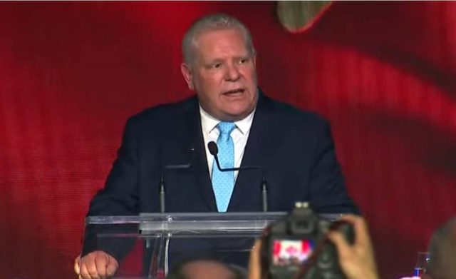 Ford also delivered a victoryspeech as if he were the Prime Minister of Canada instead of the Premier of Ontario. At 9:34 in CPAC’s video, the electronic screens displaying a blue background for the Progressive Conservative Party of Ontario suddenly morphed into a fluttering Canadian flag: