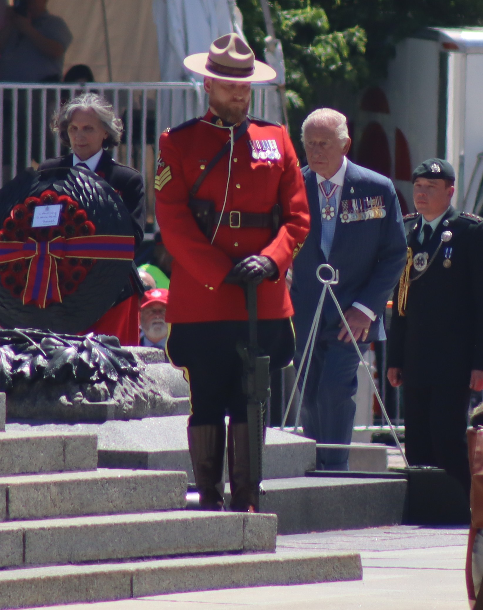 From a vantage point on Parliament Hill, I took these photos of His Majesty King Charles III of Canada while he and the Queen consort greeted dignitaries at the national cenotaph.